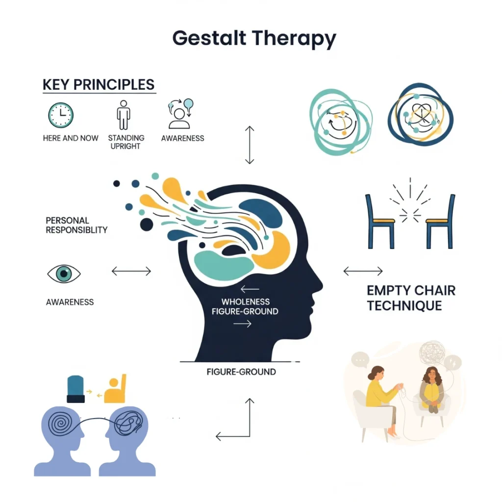 Gestalt therapy is a form of psychotherapy that focuses on the present moment, emphasizing personal responsibility and awareness. Developed by Fritz Perls, Laura Perls, and Paul Goodman, gestalt therapy is a holistic approach that considers the individual’s thoughts, feelings, and behaviors as interconnected and interdependent.